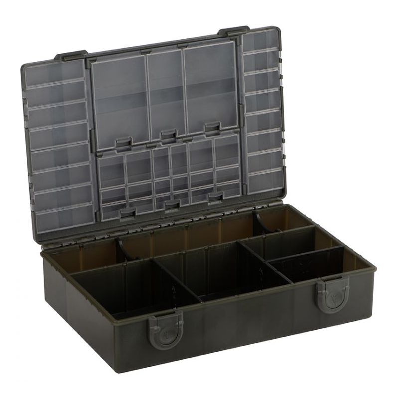 Osnova kutije za pribor dizajnirana je za smještaj svih novih standardnih i XL kutija s unutarnjim pretincima, podesivih kutija s pretincima, kutija s udicama plus genijalne Leader police u Standardu i XL. Kutija ima 3 dugačka, 2 kratka i 1 srednji pregradnik koji se može ukloniti i odvaja bazu te vam omogućuje prilagođavanje željenoj konfiguraciji. Razmak utora za pregradu pažljivo je razmotren kako bi se maksimalno iskoristio raspoloživi prostor, osiguravajući da kutije s unutarnjim pretincima ne zveckaju okolo u izgubljenom prostoru i da se sve vrste završnih pribora učinkovito učvrste. U ovu kutiju može savršeno stati bilo što, od alata za opremu i standardnih kalema dužine kuke do većih kalema u stilu vodećih.